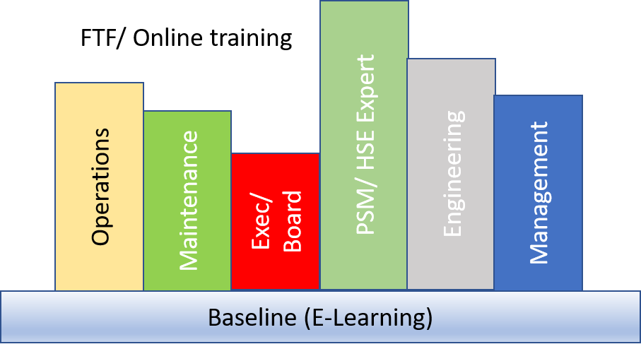 I have been running a process safety training business for over 15 years and see these dynamics time and time again. With internal staff movements and constraints on training spend, many do not materially move forward over several years. How do we broaden out the skill pool so that every person associated with an operation understands the basics and can more effectively contribute to PSM? The following training model is proposed to help facilitate delivery of organisations PSM development. E-Learning can be used to develop baseline knowledge providing a foundation to the organisations competence development.
